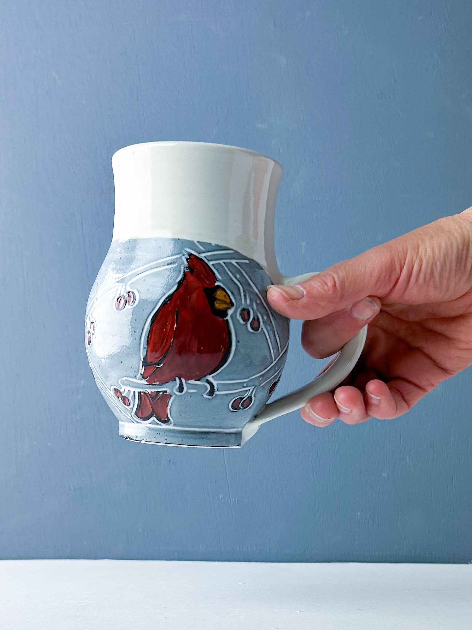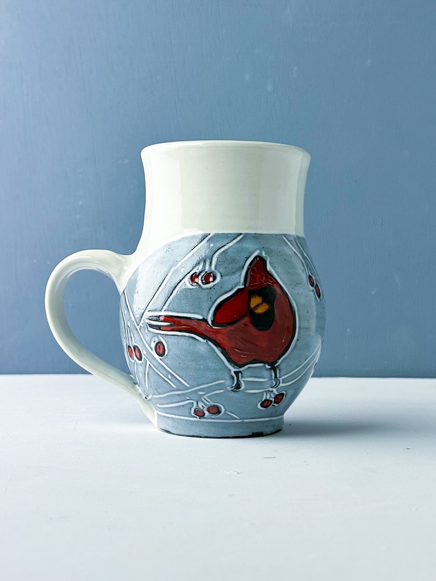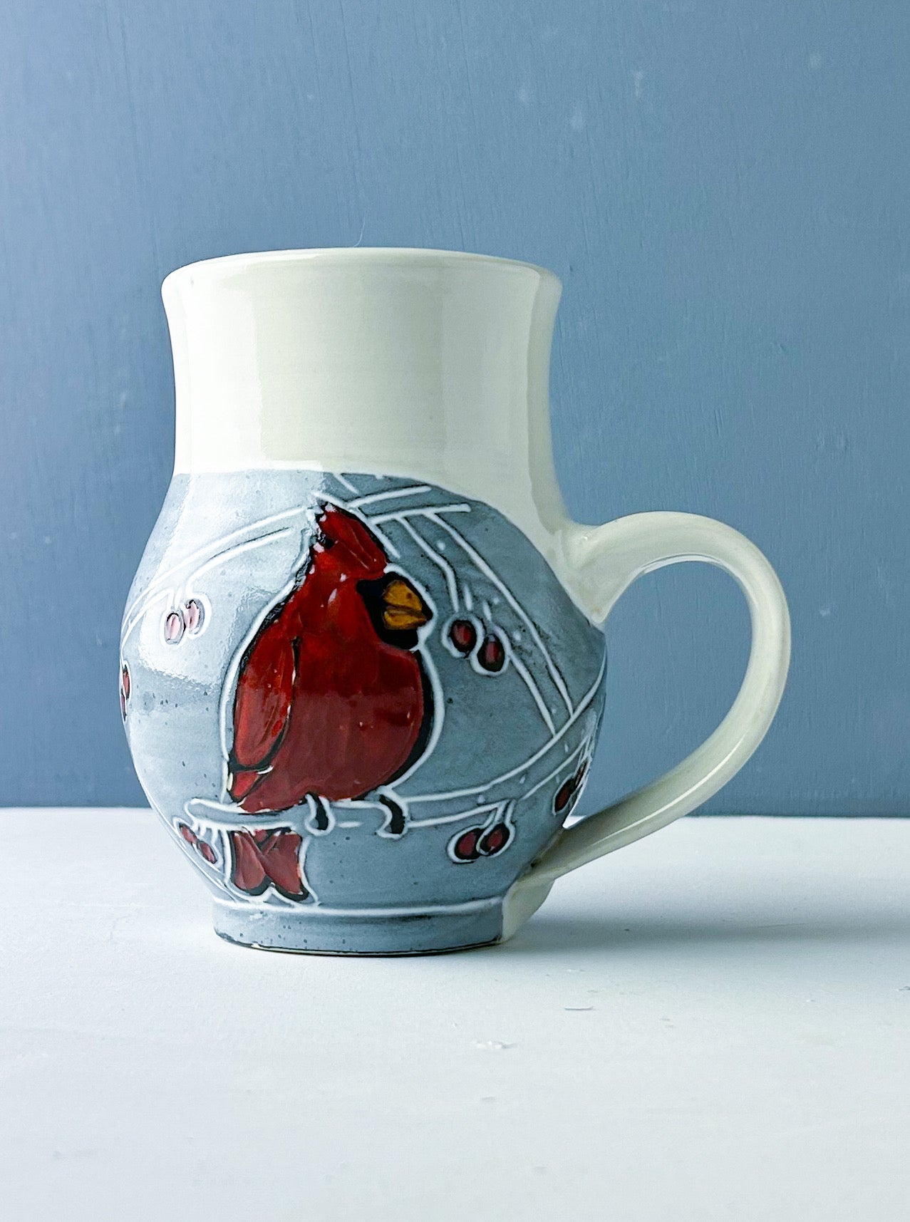 Red cardinals in the berry laden branches decorate this generous mug. Hand thrown white stoneware is overlain by a black underglaze and carved through to create the design. White glaze over black underglaze creates a gray hazy background that makes the birds and berries pop. The mug easily holds 16-18 ounces of your favorite beverage. Handmade sgraffito pottery.