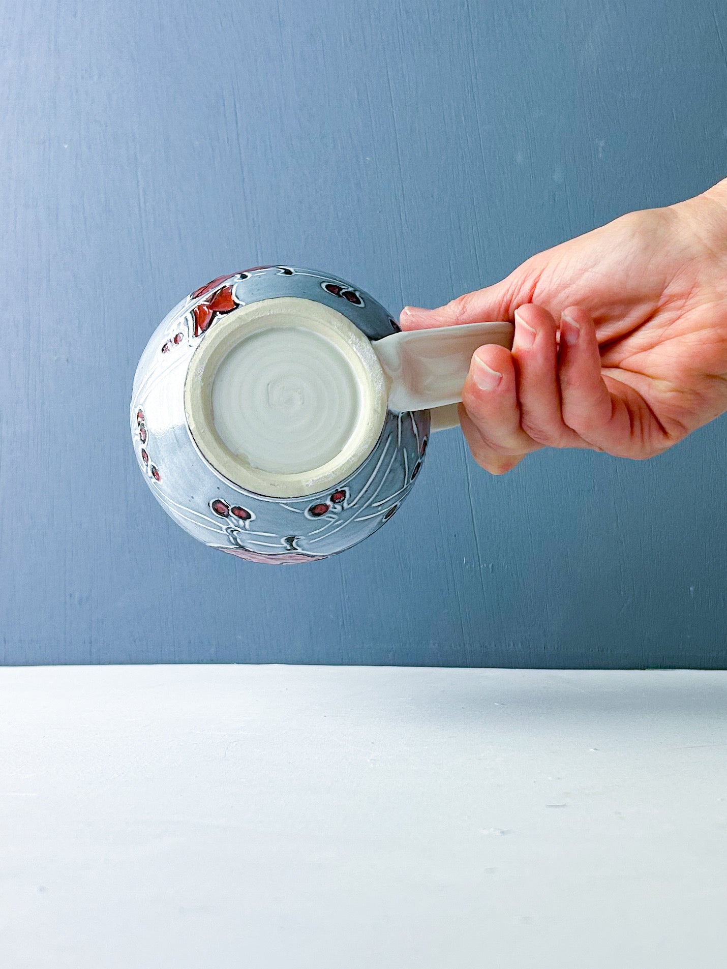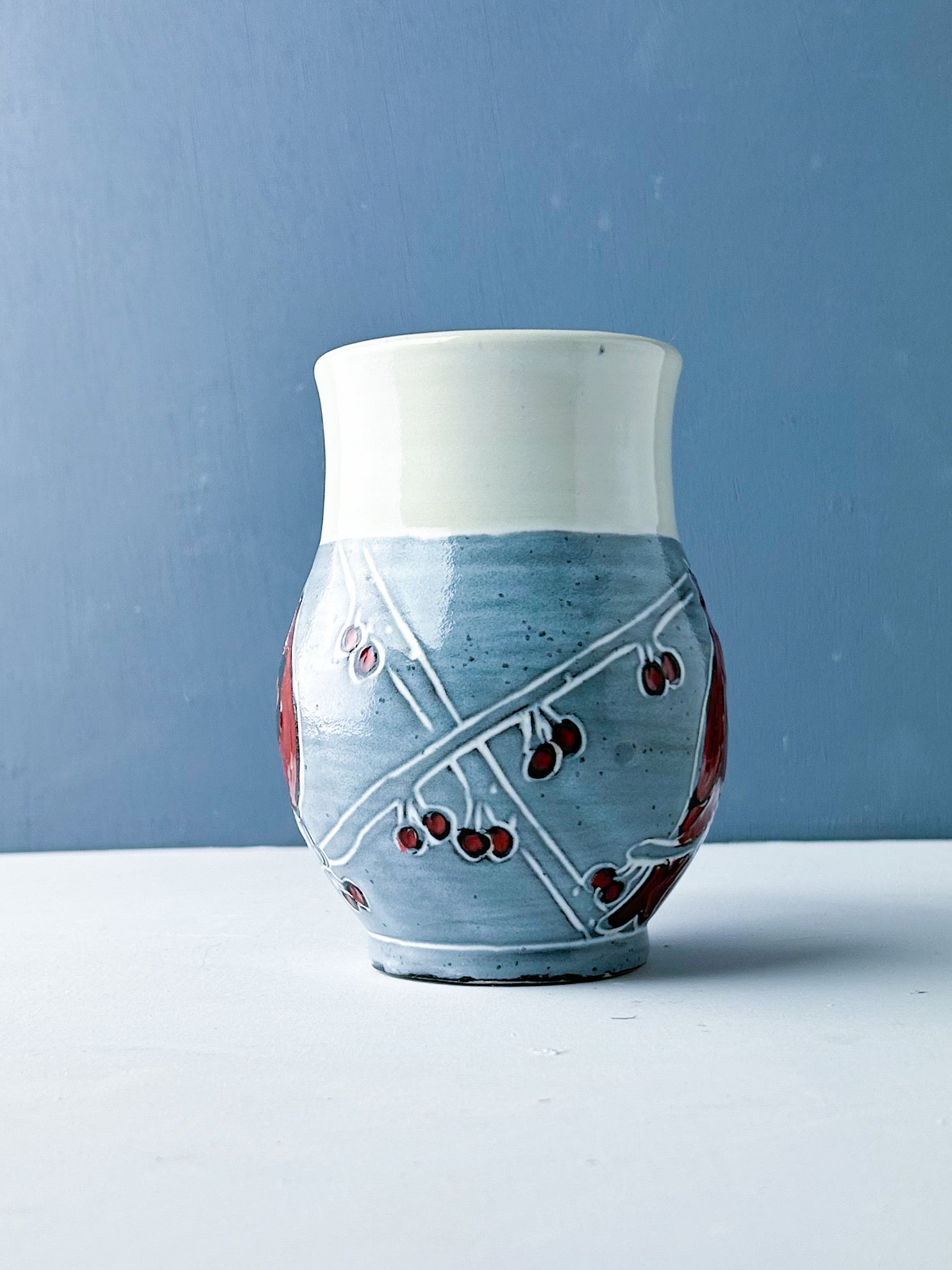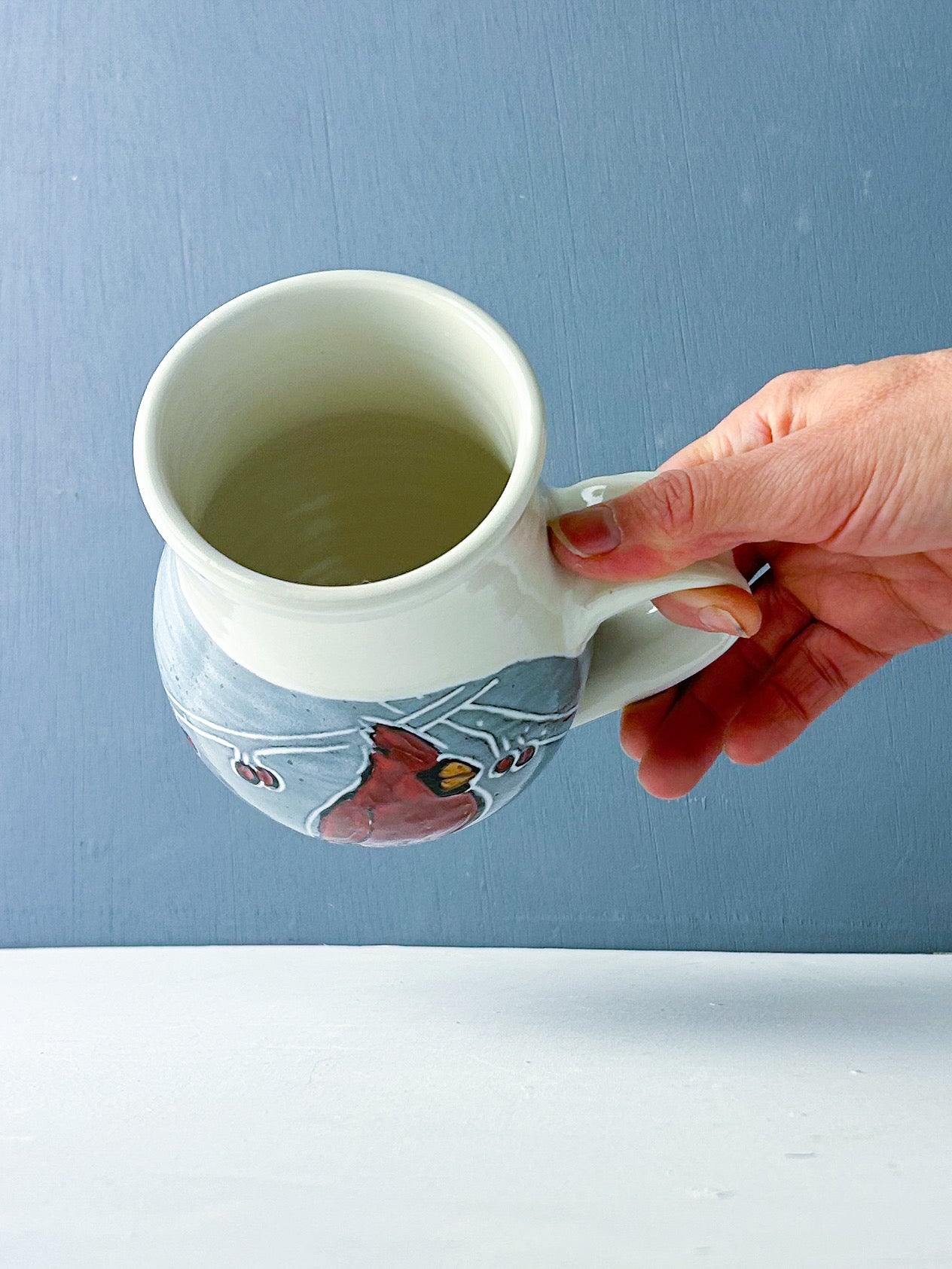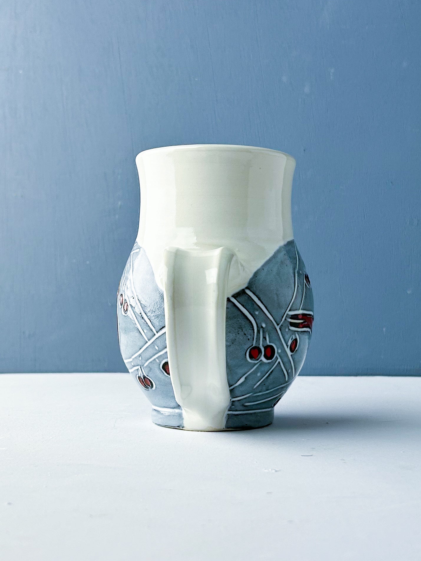 Red cardinals in the berry laden branches decorate this generous mug. Hand thrown white stoneware is overlain by a black underglaze and carved through to create the design. White glaze over black underglaze creates a gray hazy background that makes the birds and berries pop. The mug easily holds 16-18 ounces of your favorite beverage. Handmade sgraffito pottery.