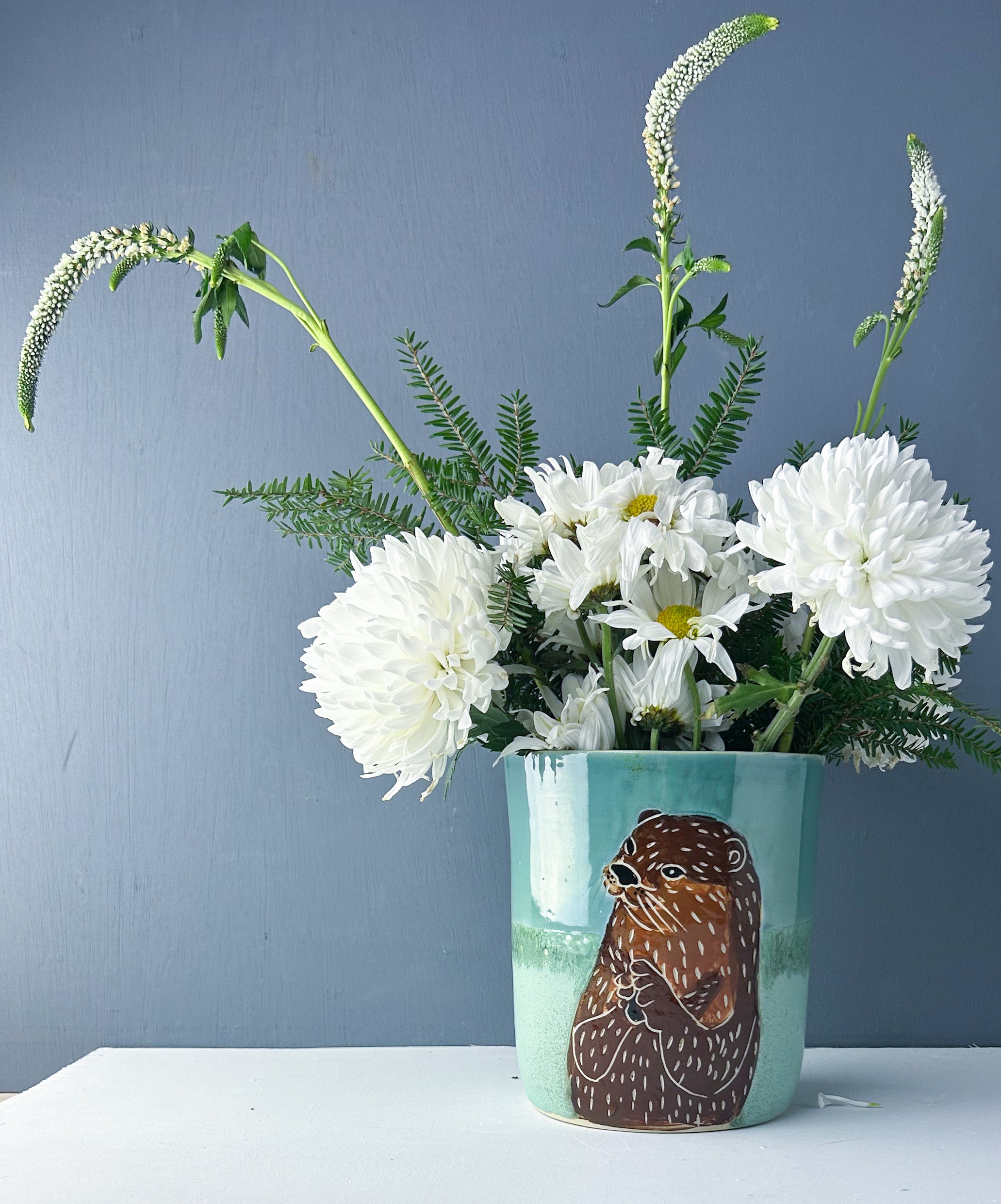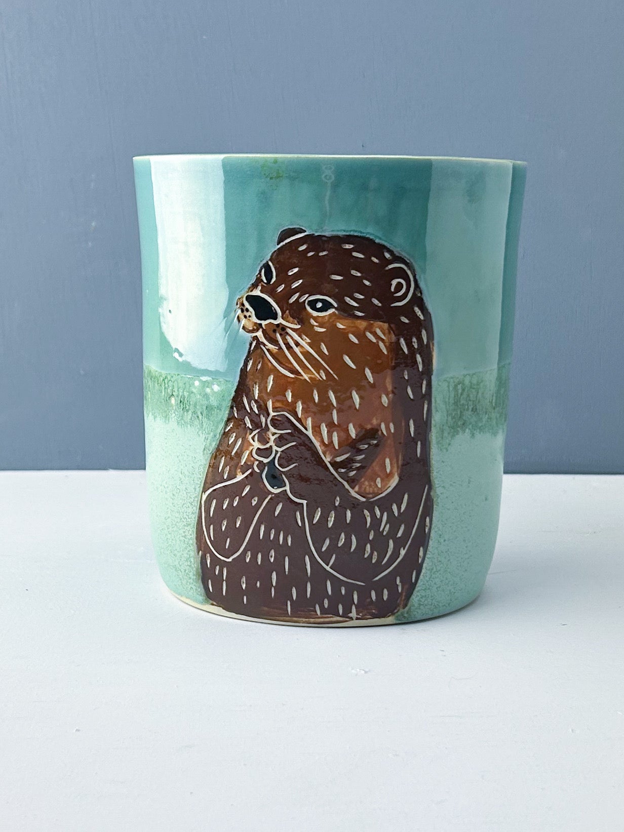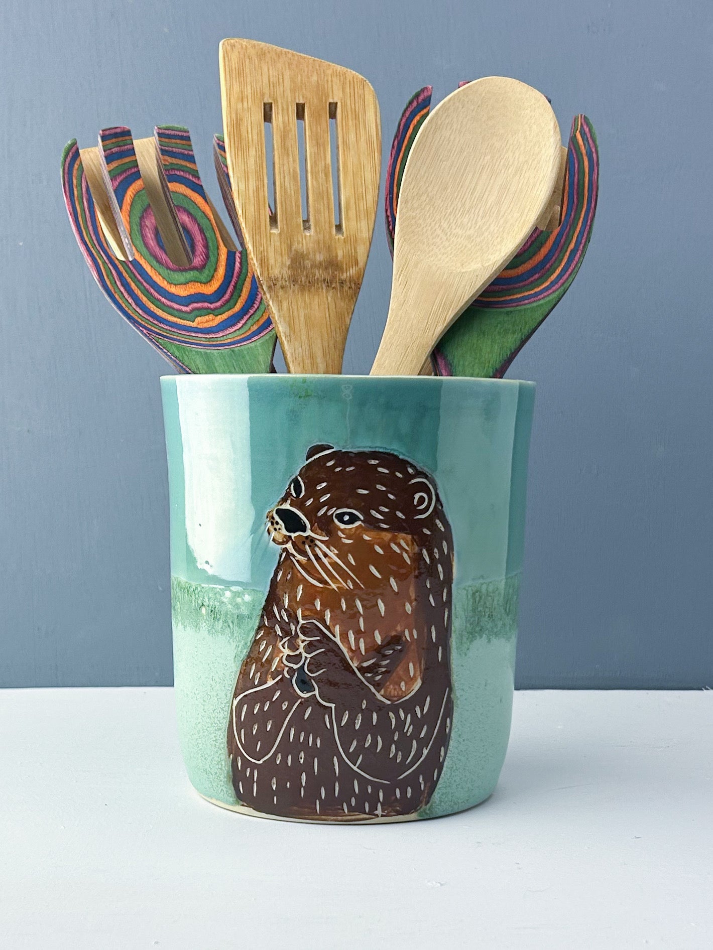 An otter holding his special rock is set against a blue and green glaze combo. The interior is also glazed in Robins Egg blue. Whether you use it for holding utensils on your kitchen counter, as a wine chiller, or as a vase, this shape offers many options.