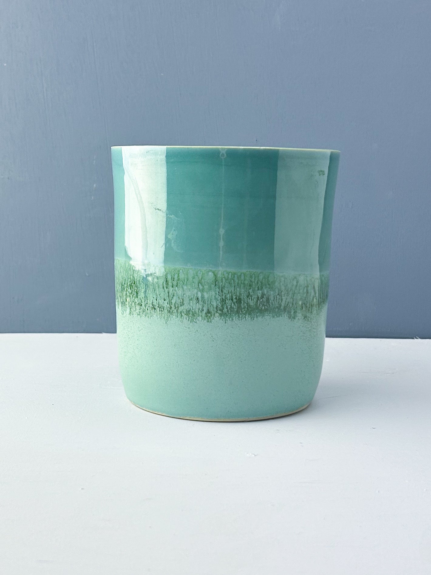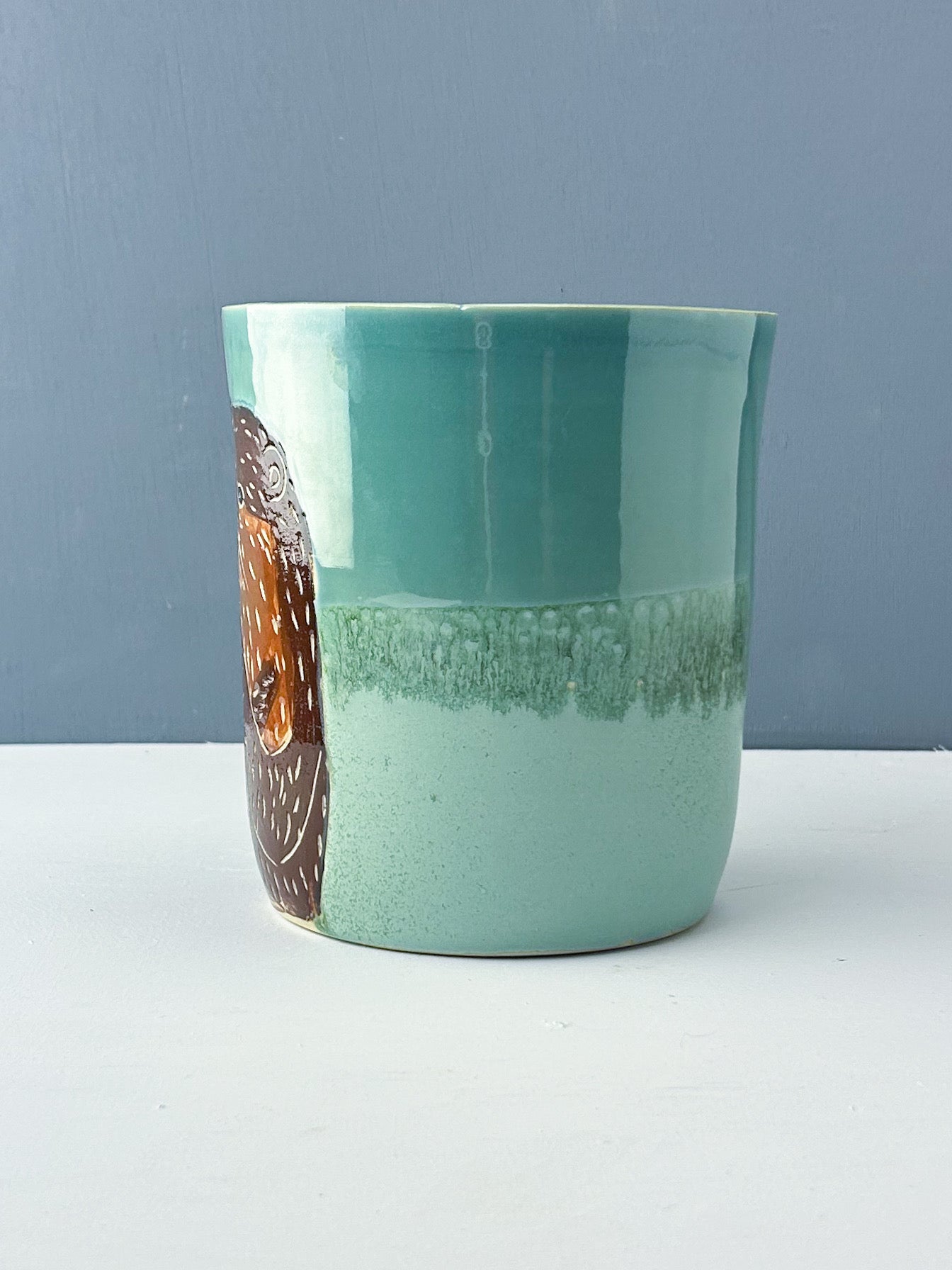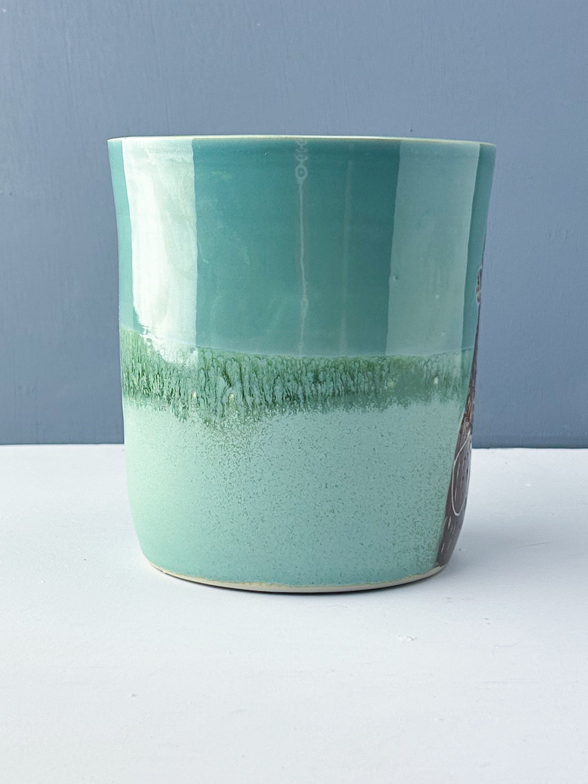 An otter holding his special rock is set against a blue and green glaze combo. The interior is also glazed in Robins Egg blue. Whether you use it for holding utensils on your kitchen counter, as a wine chiller, or as a vase, this shape offers many options.
