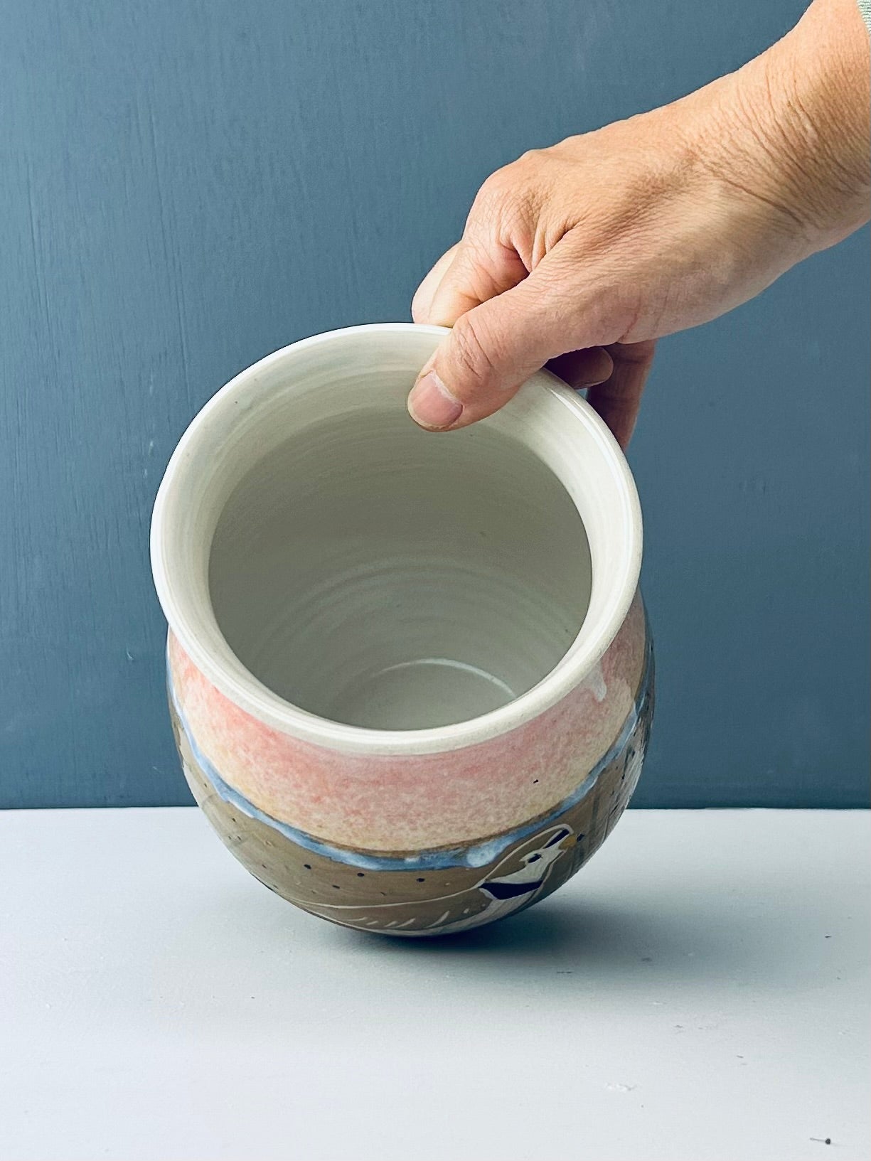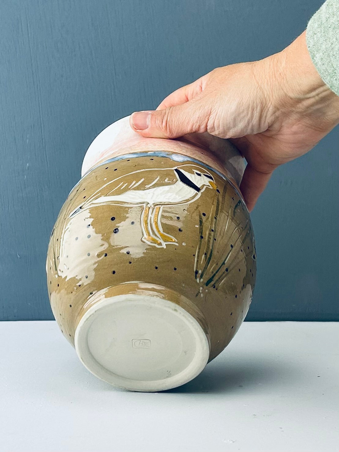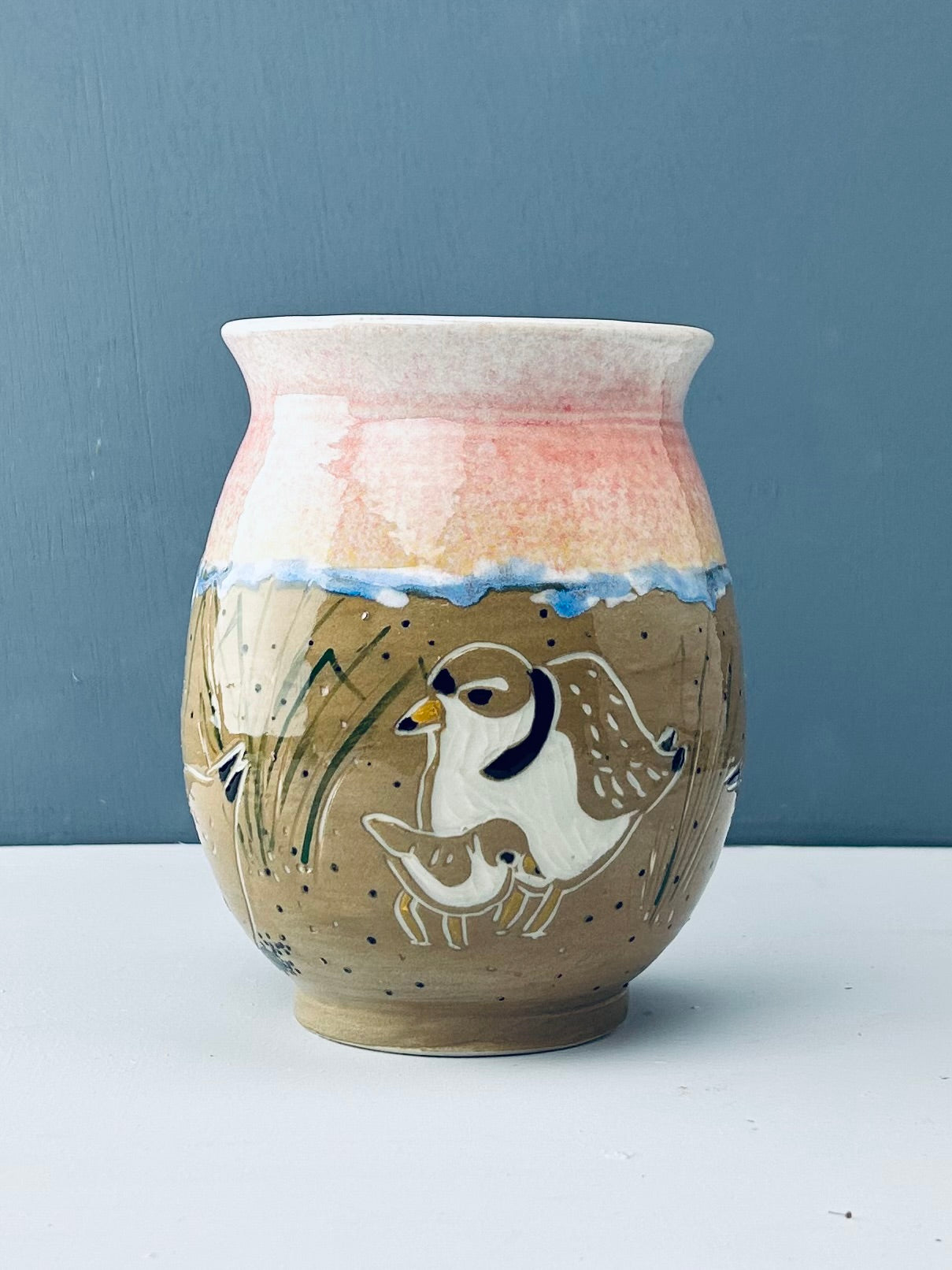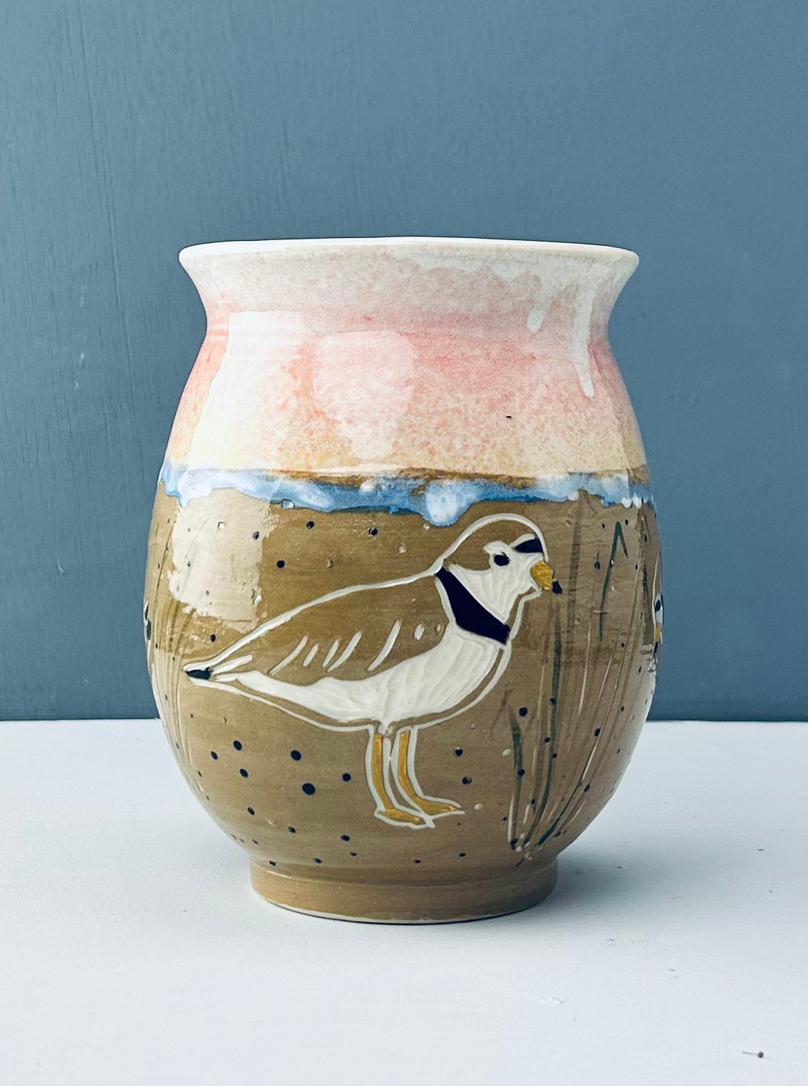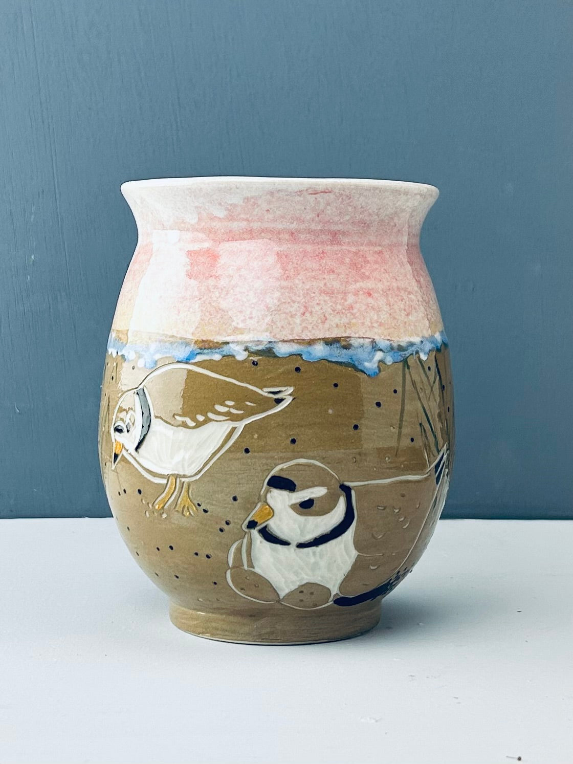 Piping plovers rest on a beach with the ocean and sunset in the background. Sgraffito carved brown speckled slip, with yellow/orange glazed sunset in the background.