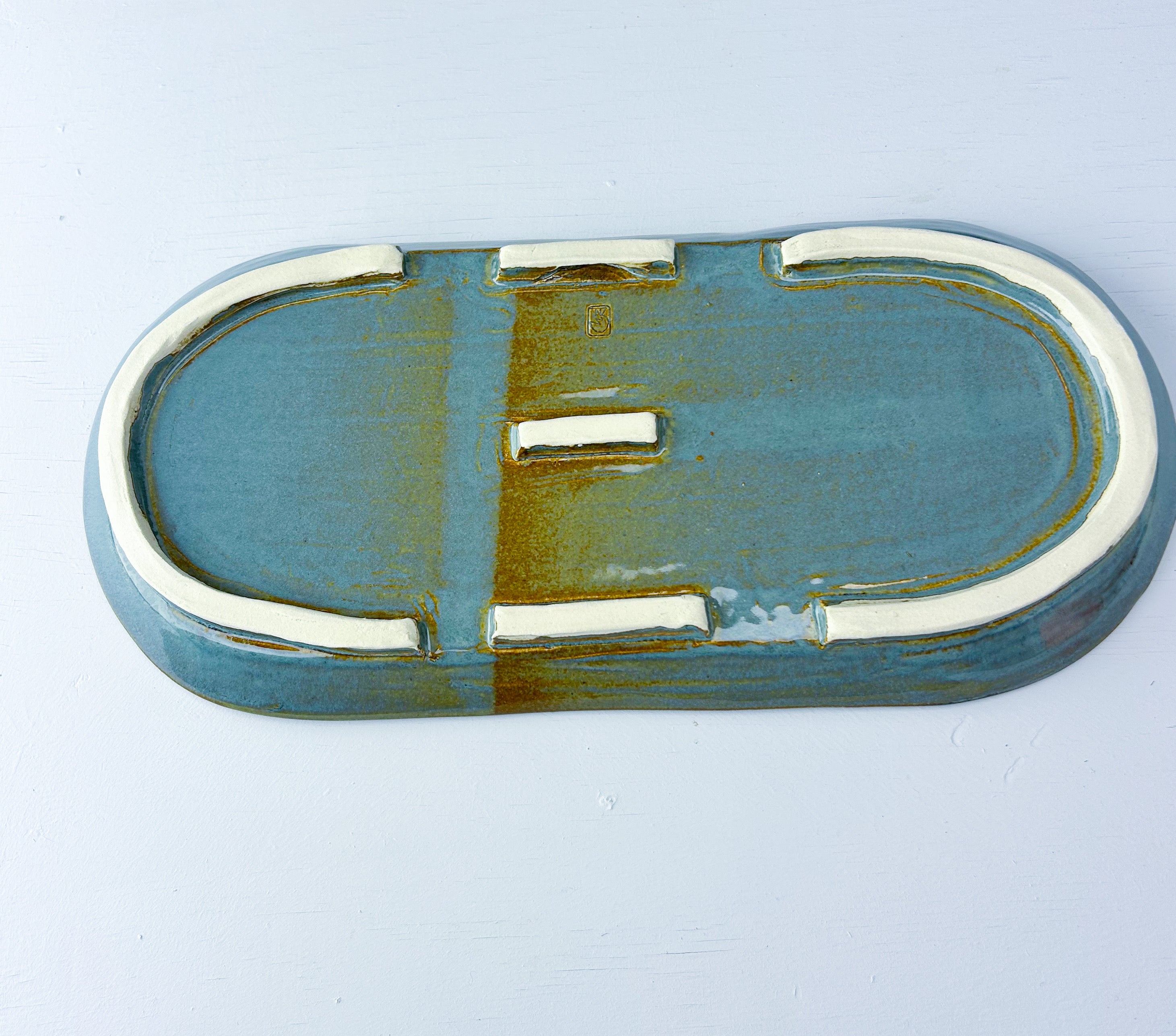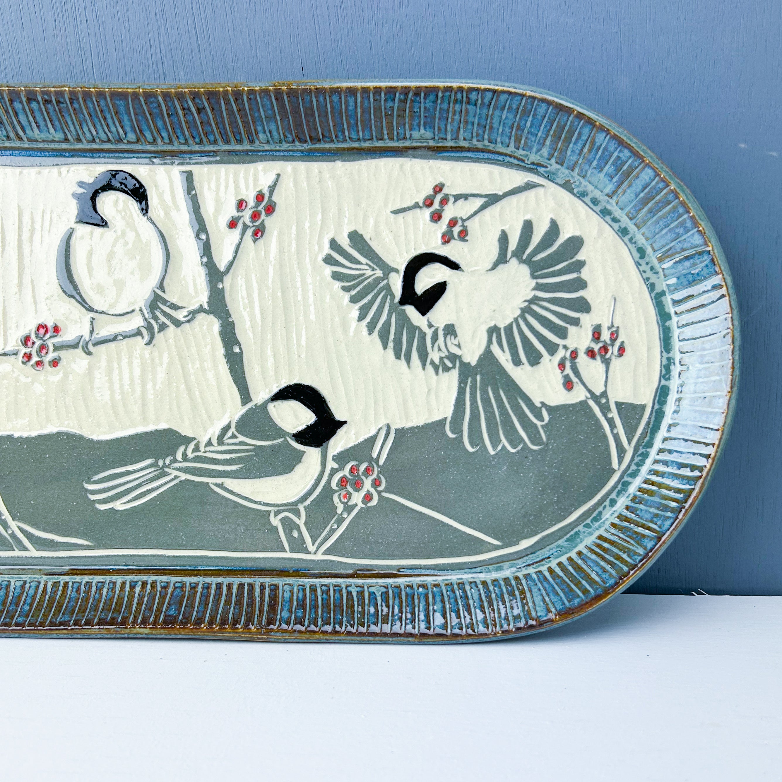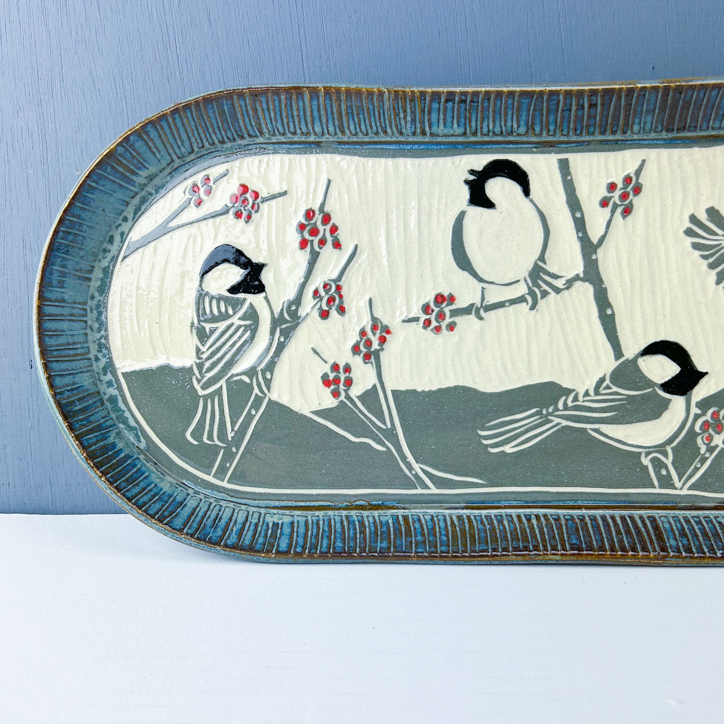 Sgraffito pottery tray with chickadees perching on maple branches budding red.   The long shape makes a perfect serving piece for appetizers, side dishes, or sushi. This piece was hand-built using white stoneware and black underglaze, then carved to create the design. This piece is finished in a blue gray  glaze with just one touch of red on the eye. A notch on the back makes the tray easy to hang when not in use.