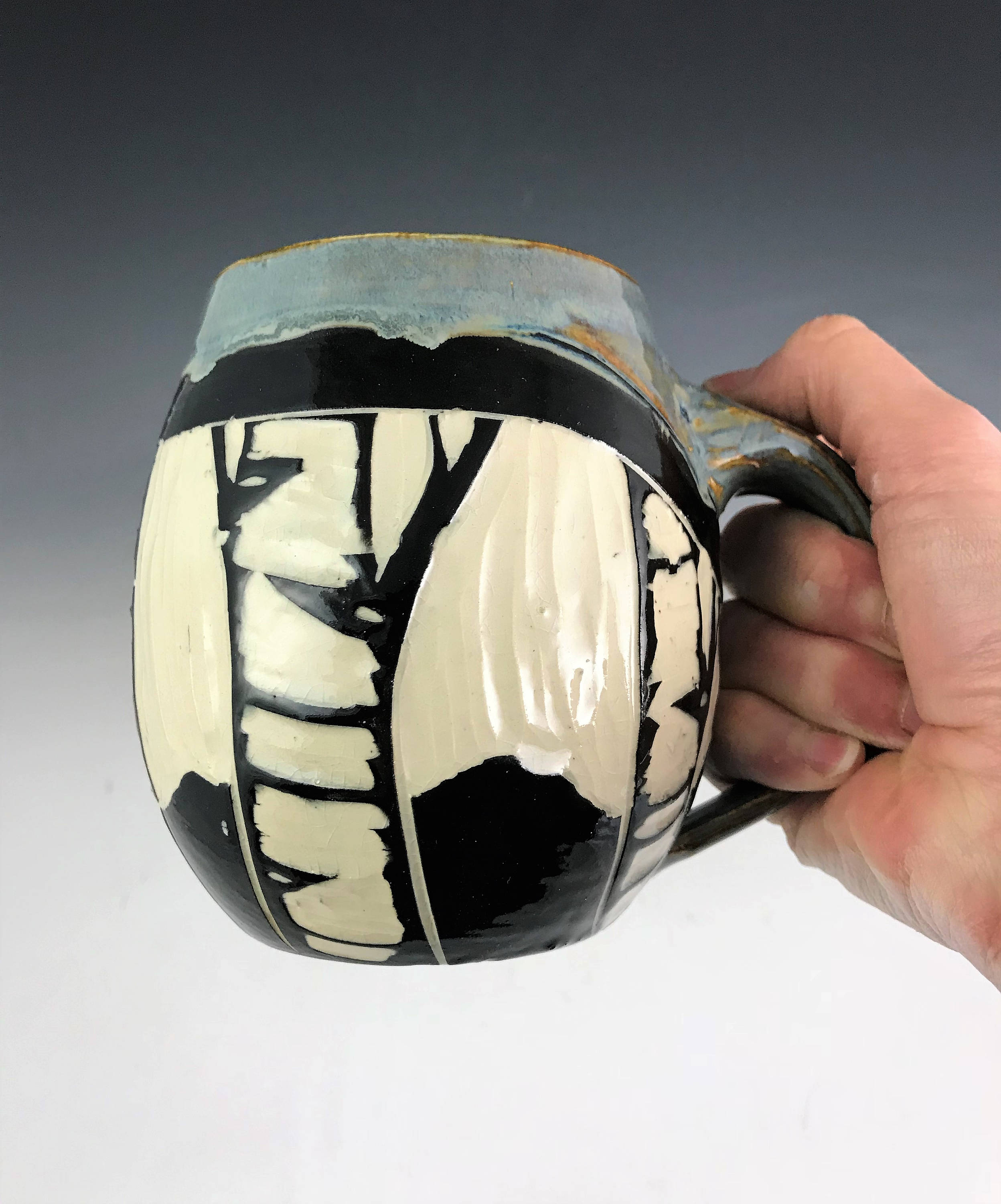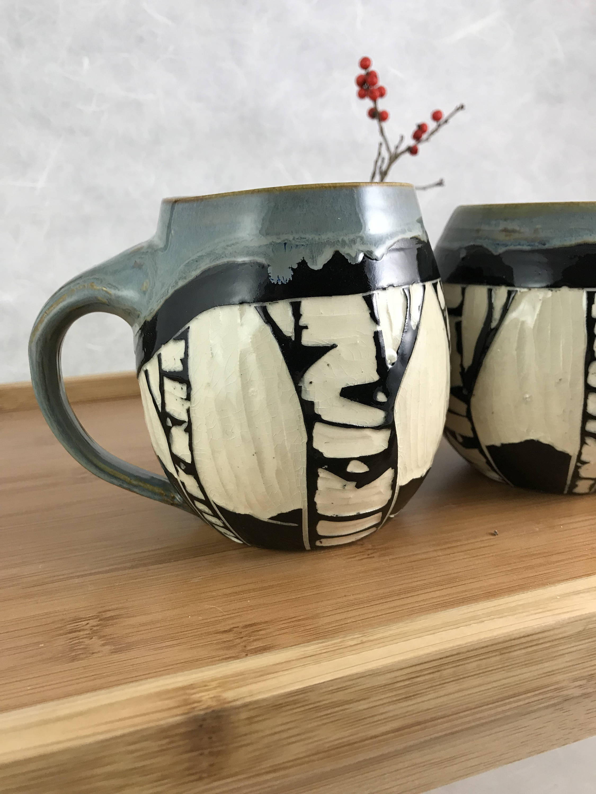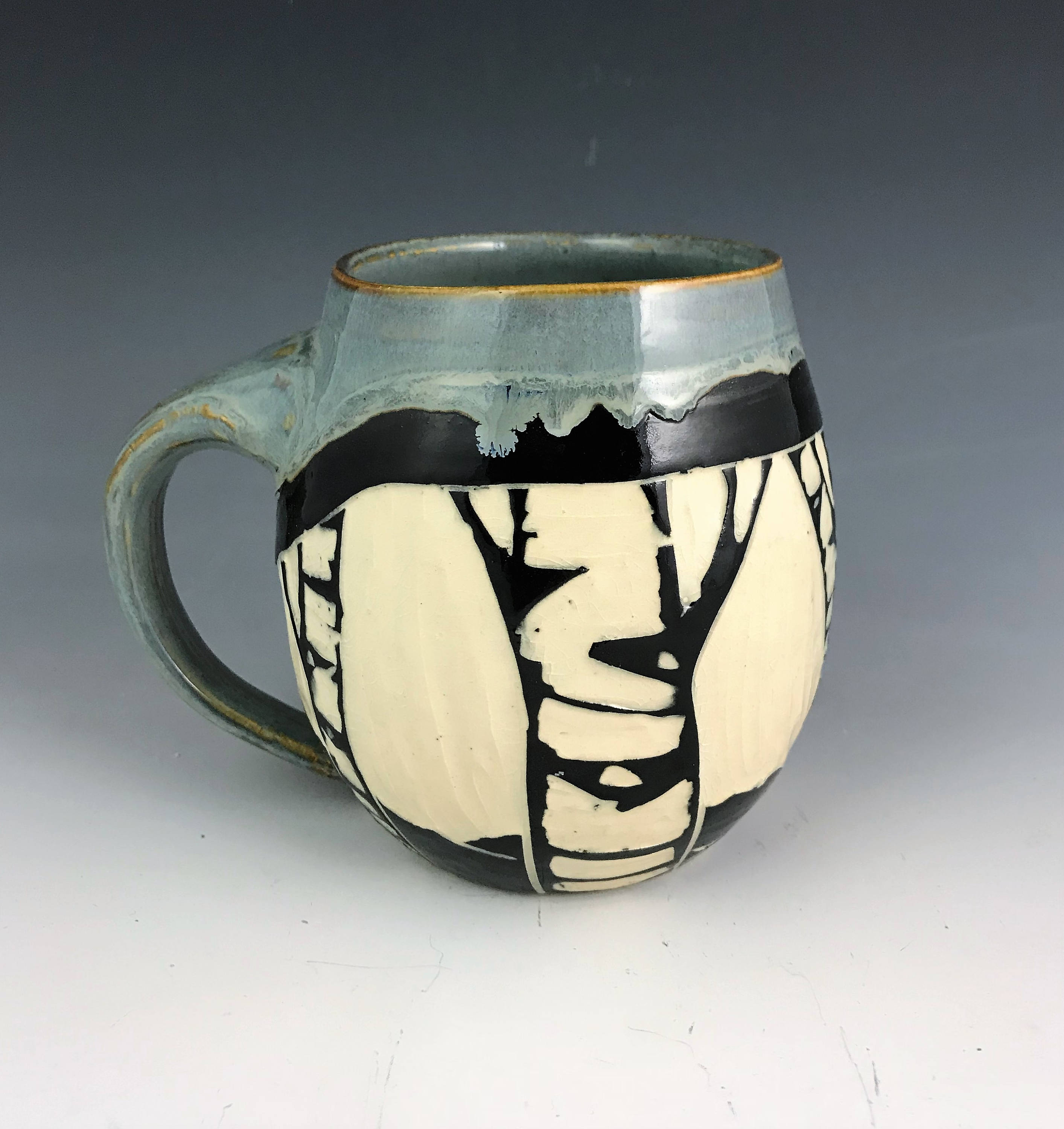Peaceful birch trees decorate this generous mug. Hand thrown white stoneware is overlain by a black underglaze and carved through to create the design. Gray glaze with shimmers of brown and blue compliment the bold black and white design. This mug easily holds 18 ounces of your favorite beverage. Handmade sgraffito pottery