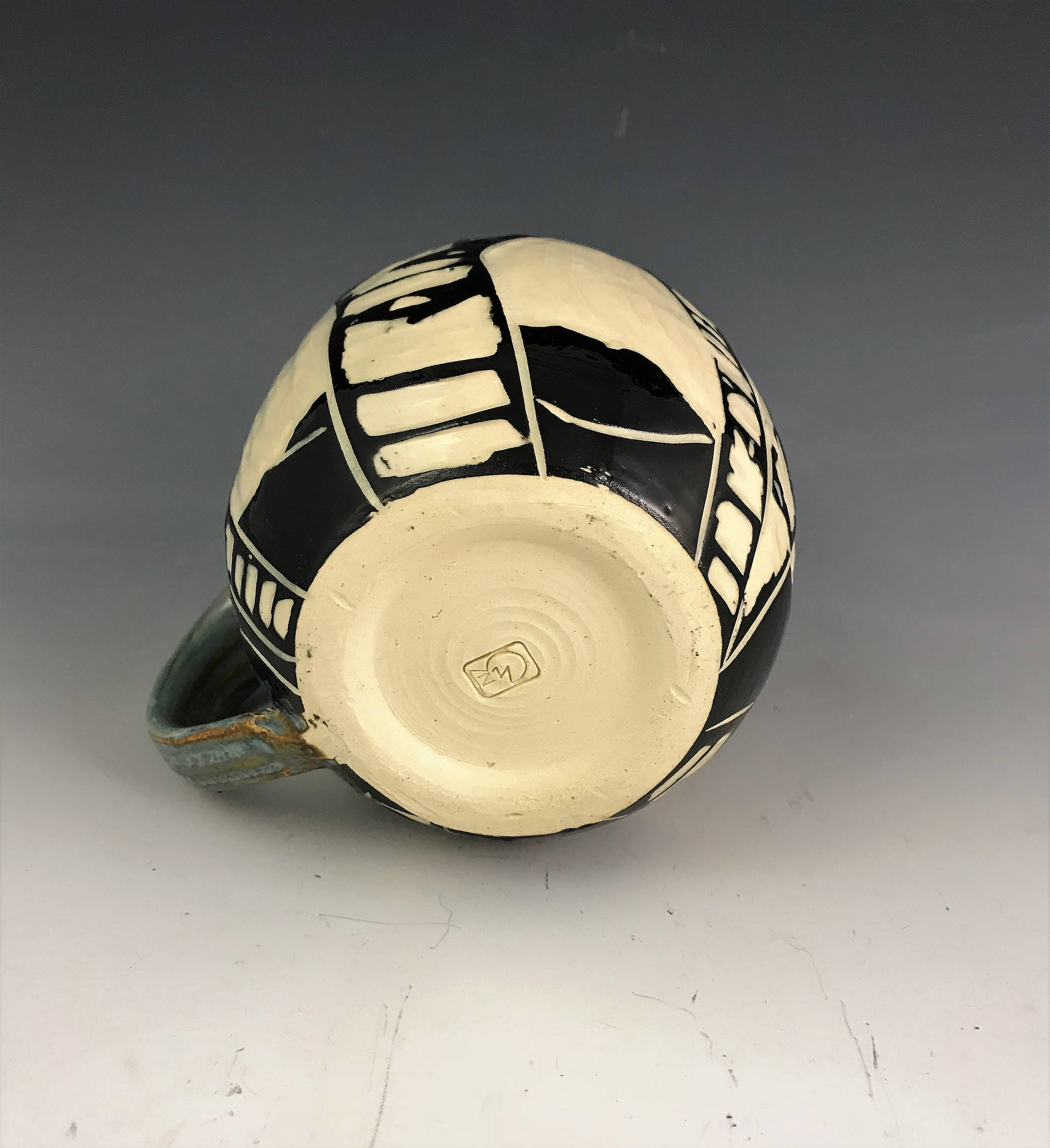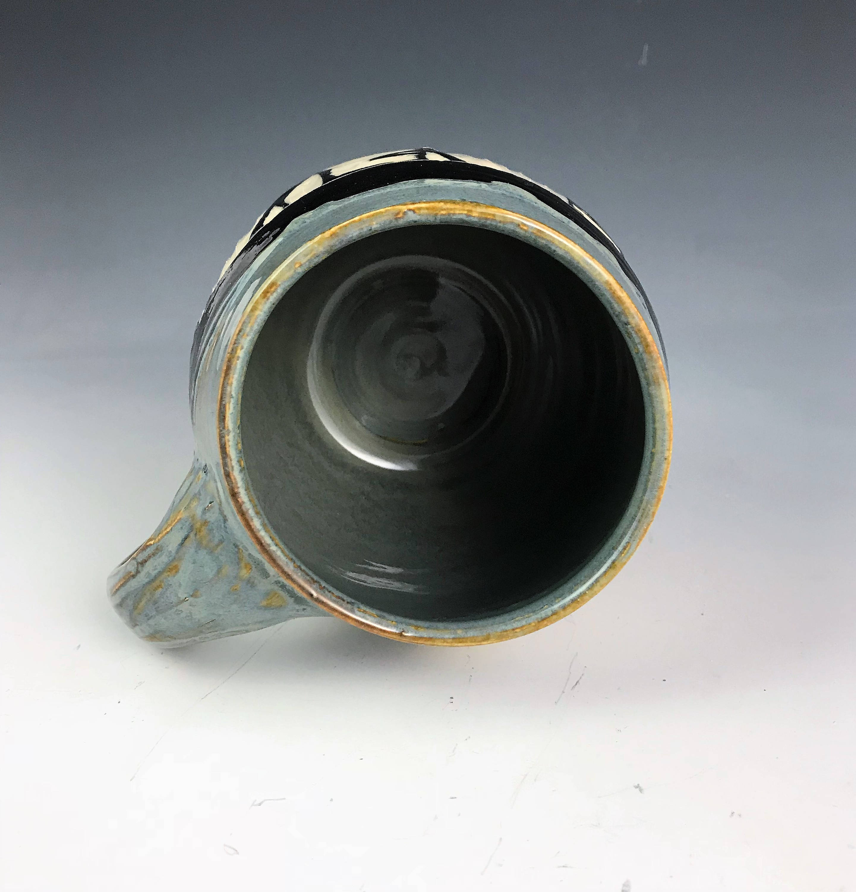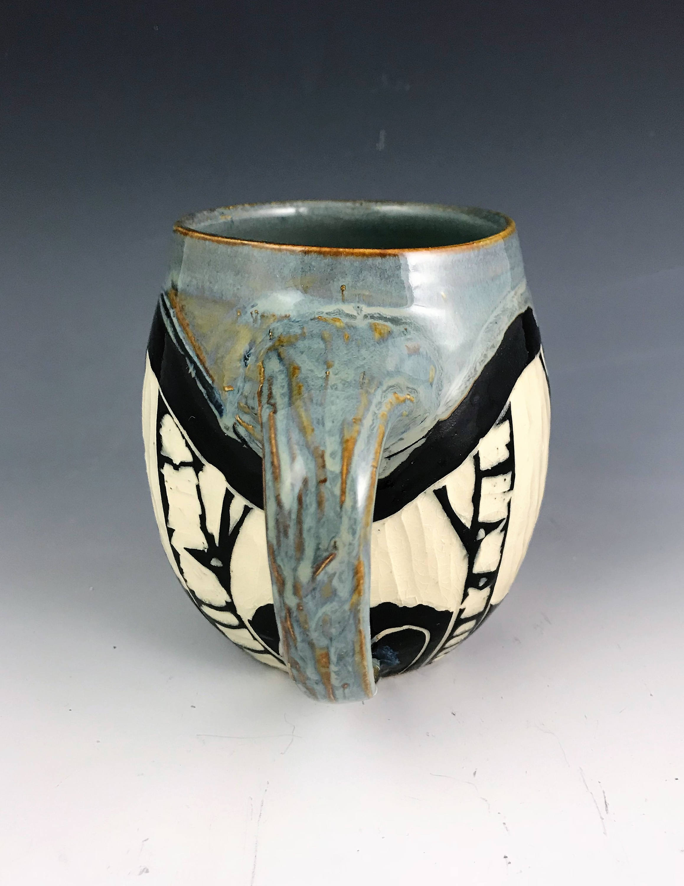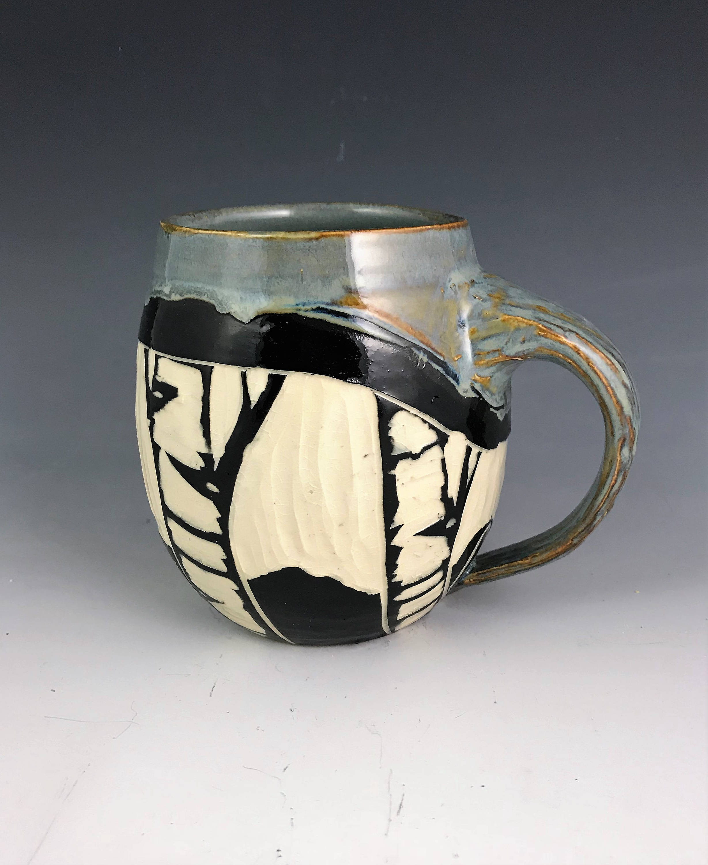 Peaceful birch trees decorate this generous mug. Hand thrown white stoneware is overlain by a black underglaze and carved through to create the design. Gray glaze with shimmers of brown and blue compliment the bold black and white design. This mug easily holds 18 ounces of your favorite beverage. Handmade sgraffito pottery