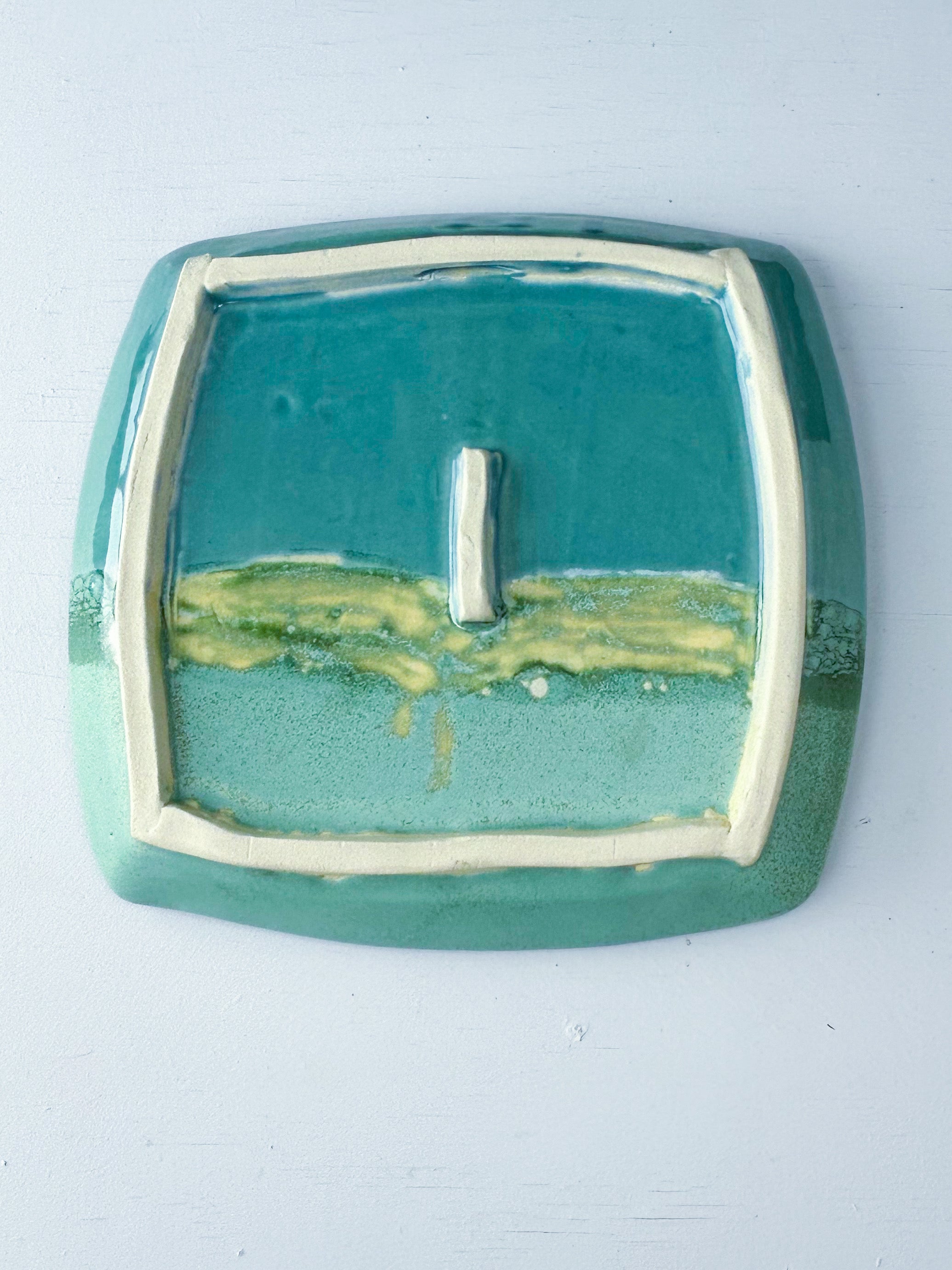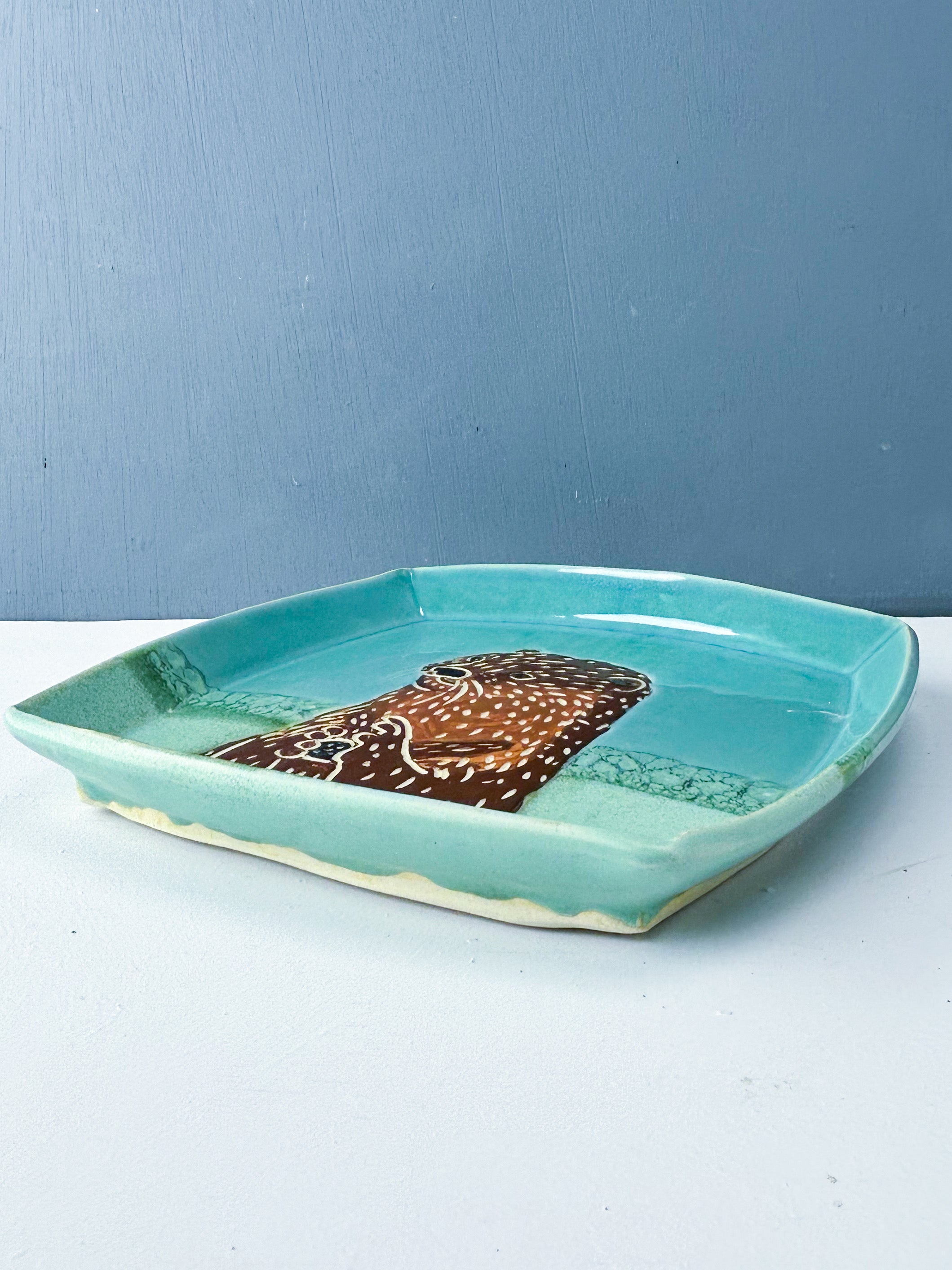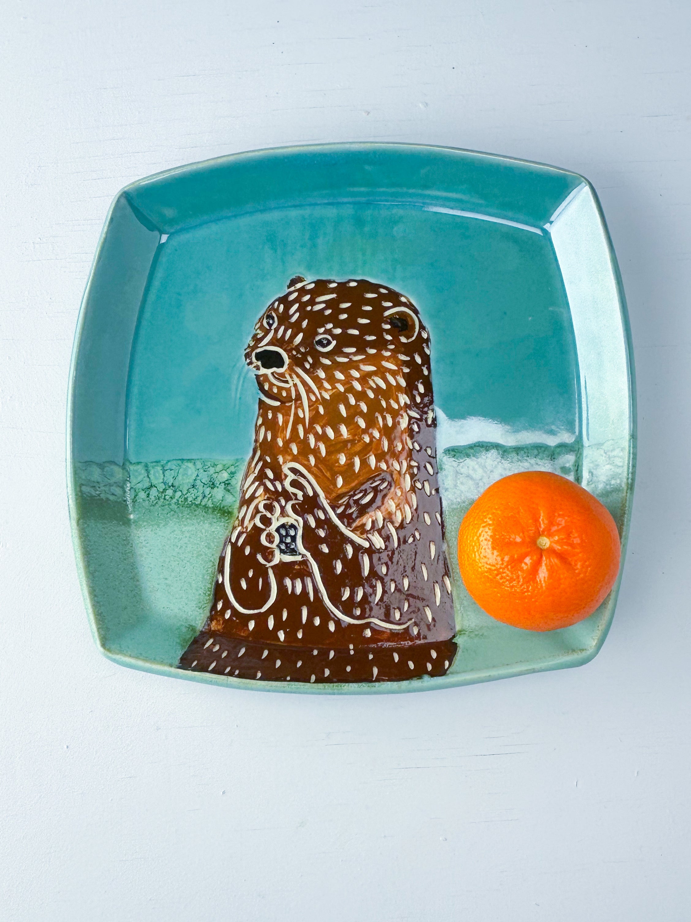 This dinner sized plate is handbuilt and handcarved with an otter holding a rock on a blue and green glazed background